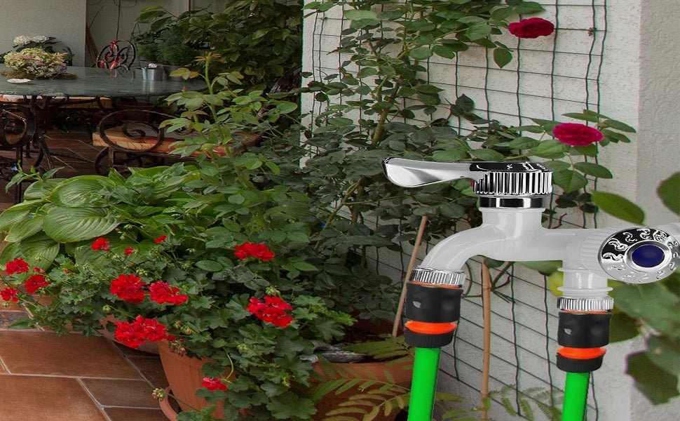 The dual water valve faucet is made of thicken material and well-sealed, which makes it not easy to leak or corrode. The dual water faucet has 2 Connectors with separate valve control, particularly practical and allow the simultaneous connection of two hoses, Materail: Plastic, Ceramics & Metal.