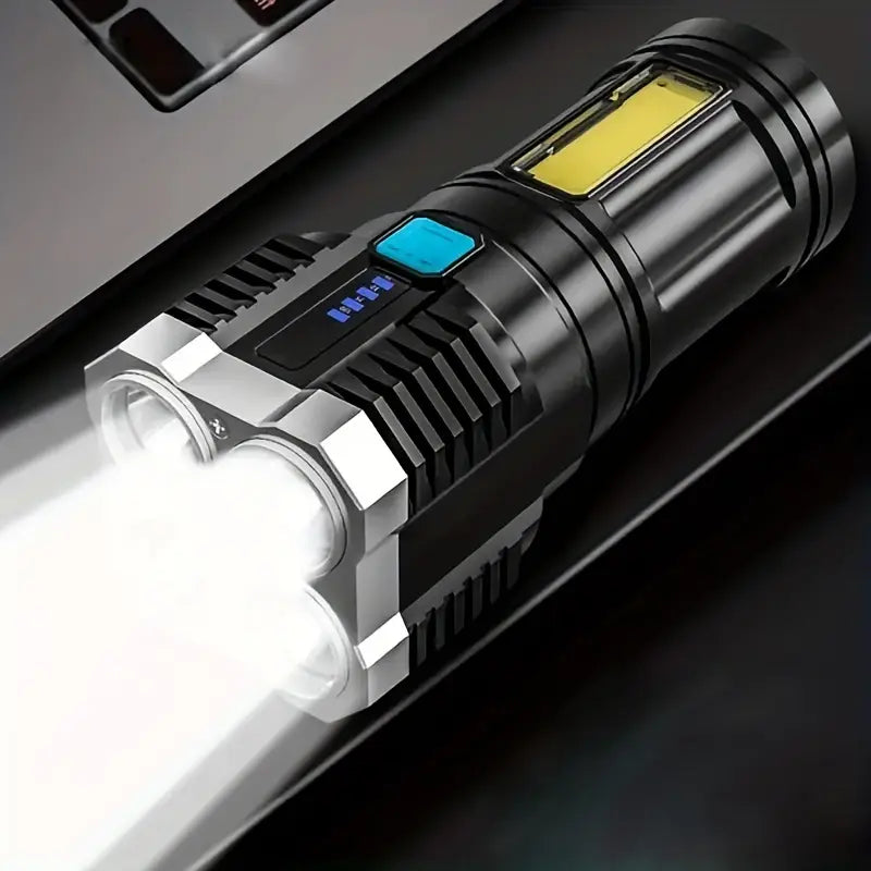 - 【4 Lighting Modes】Rechargeable flashlight has High, Low, Strobe and COB side lighting modes. You can choose the lighting mode according to your needs. Just press the button to change the light mode. This flashlight can be used as a standard flashlight, work light and emergency light for home use, meeting most people's lighting needs in daily life.
