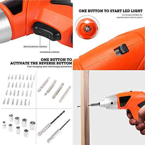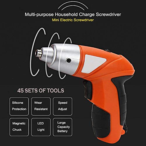 - 45 Piece Cordless Screwdriver Set Perfect for Simple Household Projects Ni-Cd Battery with Charger Forward Neutral Reverse Drive.