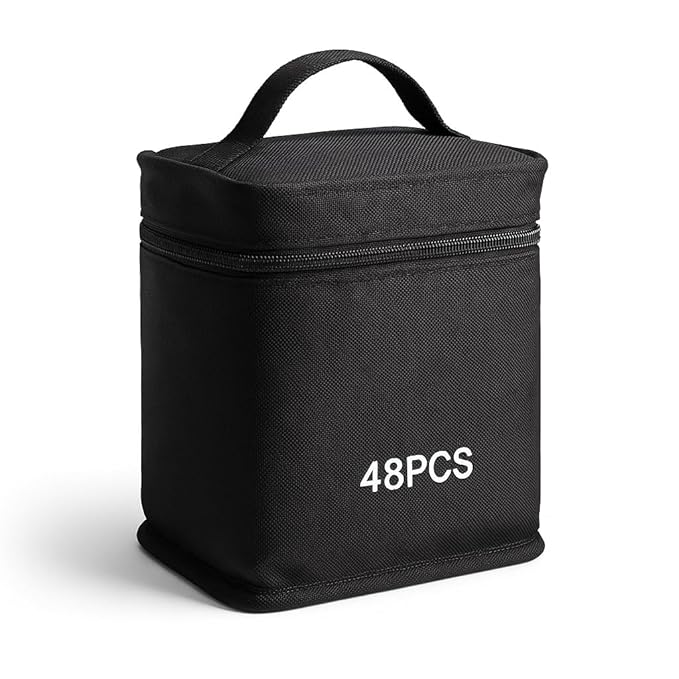 This 48-piece art marker set features a wide range of vivid colors ideal for artists, designers, and hobbyists. Each marker includes dual tips — a broad chisel tip for bold strokes and a fine tip for detailed work. The alcohol-based ink ensures smooth blending and consistent color output. The markers come neatly organized in a durable black zippered carrying case, making them easy to store and transport for use at home, school, or the studio.