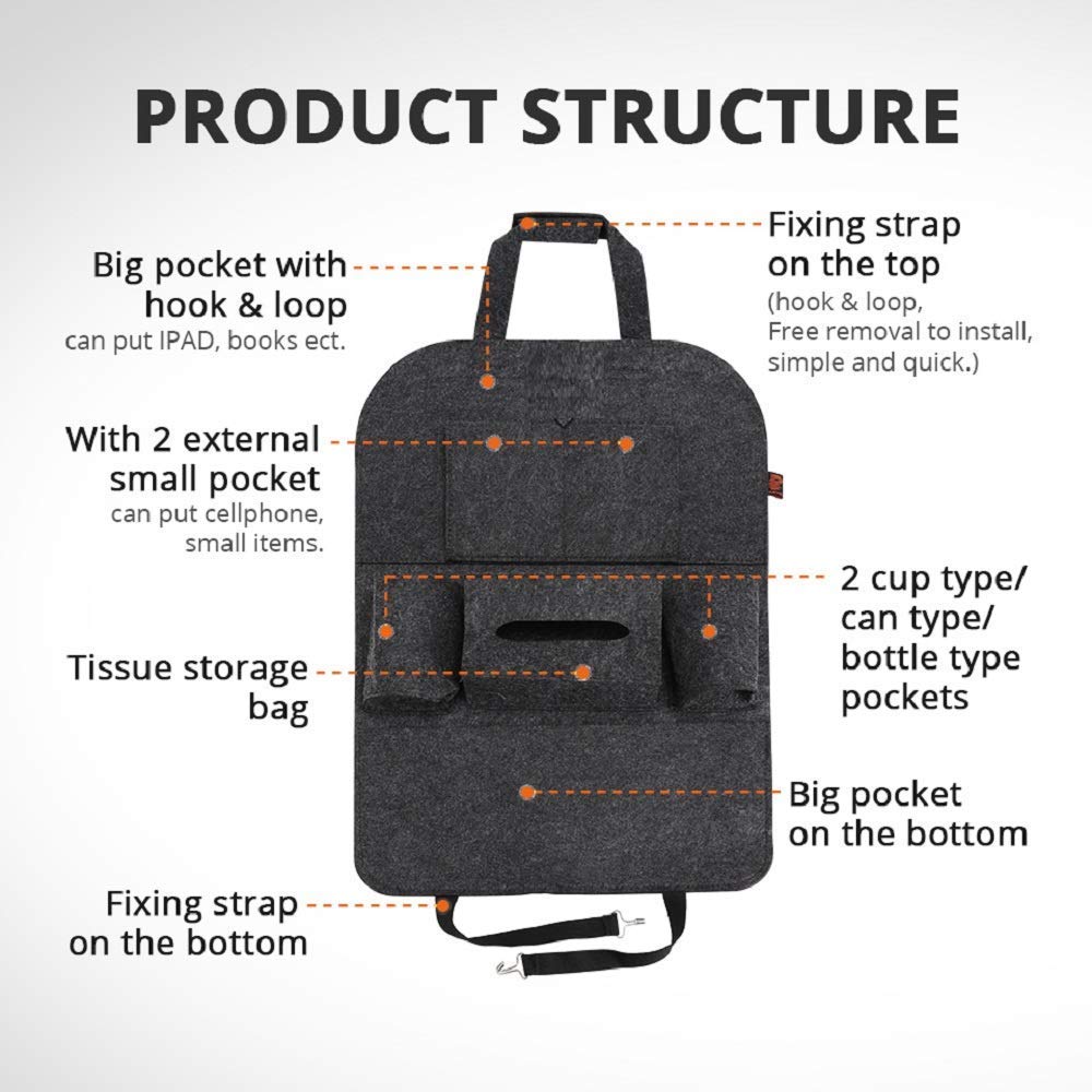 - Sturdy foldable tray and adjustable - made of hard board, bear up to 2kg items, take your eating on the go more convenient and safe, Long enough adjustable top and bottom buckle straps, The bottom strap remains tucked under the seat back so the driver and passenger don't feel it, The backseat organizer will stay in place it won't slide off your car seat