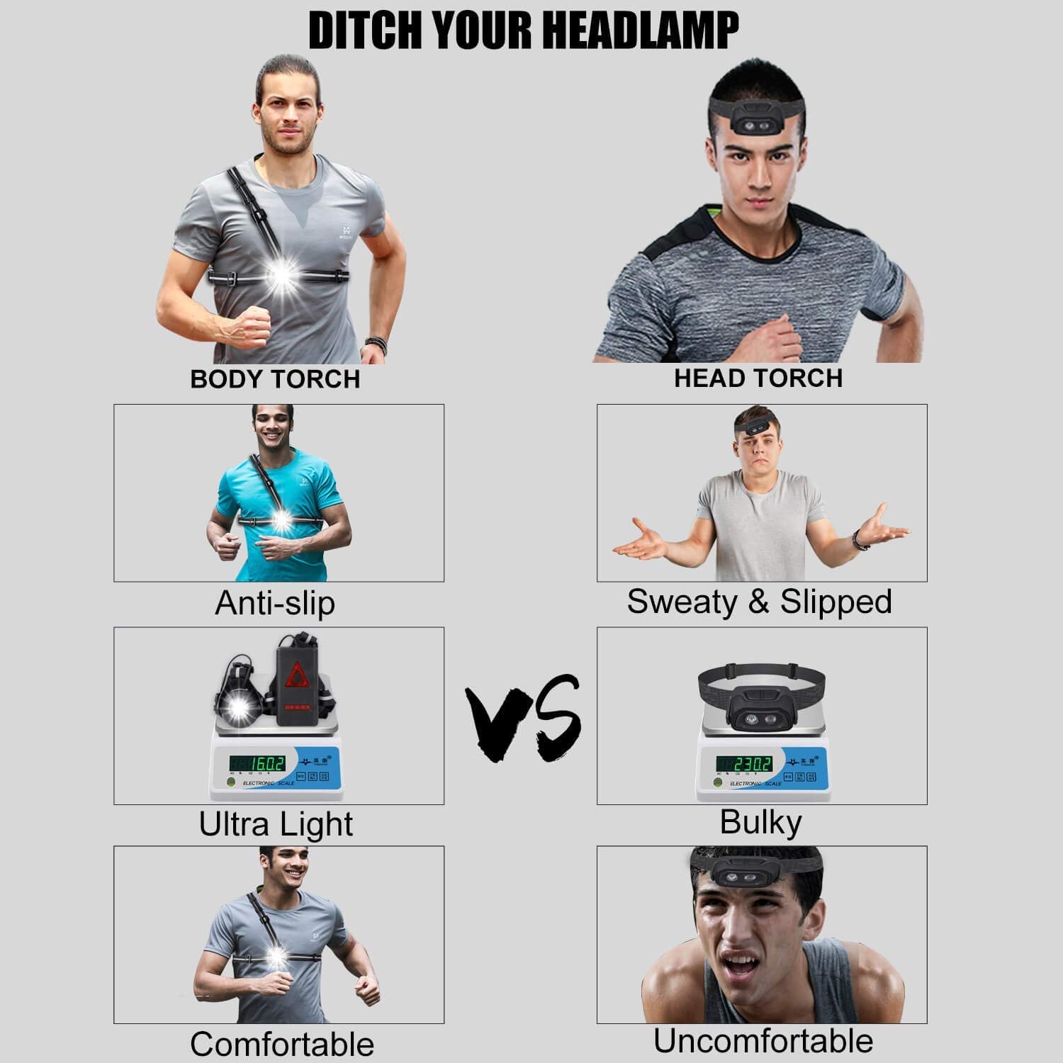 Powerful LED Running Light & 3 lighting modes 250 lumens of power which guarantees visibility from 0 to 20 meters. A cool white LED lighting on the front and there are 3 lighting positions of this running lamp: high, medium, strobe (strobe) on the front and the LED lamp also has 8 red LED flashing lights on the back for protect your safety. Adjustable Strap & Comfortable to WearWith the adjustable length strap with elasticity, Sport Lighting allows you to adjust your height, easier to carry than a headlamp. The lamp is easy to place on your chest freeing your hands and once well positioned there is absolutely no embarrassment to walk around