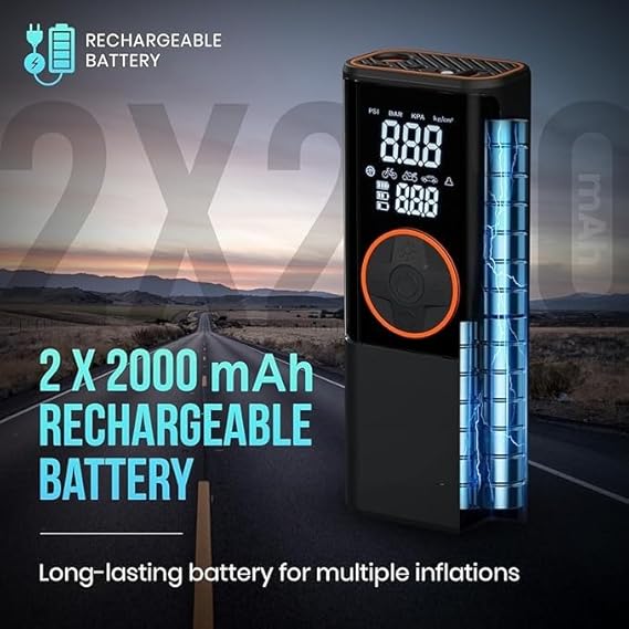This tyre inflator supports up to 150 PSI, giving quick inflation in just a few minutes. It includes multiple nozzles, a Type-C charging cable and an LED emergency light for night use.