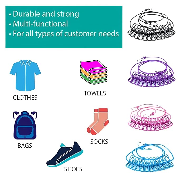 - Perfect for Travel & Outdoor Use – Lightweight and easy to carry, this multicolor drying rope is an essential travel companion. Whether you're on a road trip, hiking or staying in a hotel, it provides a convenient & efficient drying solution