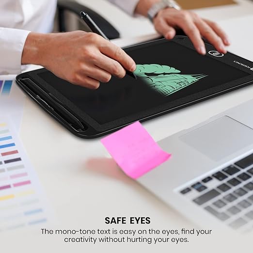 - [LATEST IMPROVED TECHNOLOGY] : Portronics New RuffPad 8.5E LCD Writing Tablet uses the Newest LCD pressure-sensitive technology and lets you draw thick and thin lines as per your preference based on the pressure on the stylus. It comes with a large 8.5 inches display. The LCD screen is totally safe, radiation free, glare free, non-toxic, light-weight, comfortable and perfect in your or your little one’s hands.