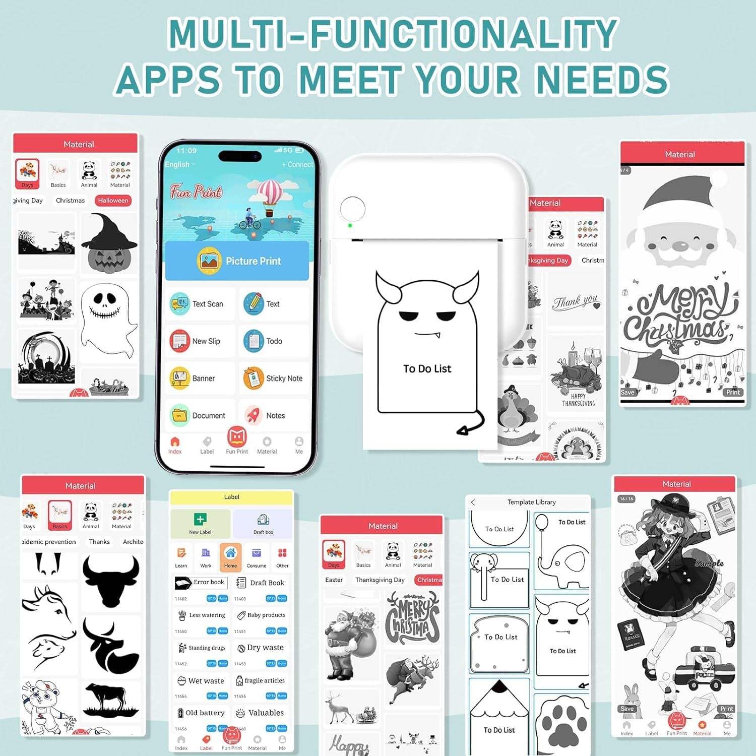 - Powerful APP】is free for users forever.One-click printing, saving time and effort,The app provides a variety of templates for you to choose from: including tags, lists, messages, and also provides a variety of material themes, such as various materials for Christmas, Easter, and Thanksgiving, as well as many daily line drawing materials. You can directly print interesting and vivid pictures by selecting different types of materials.