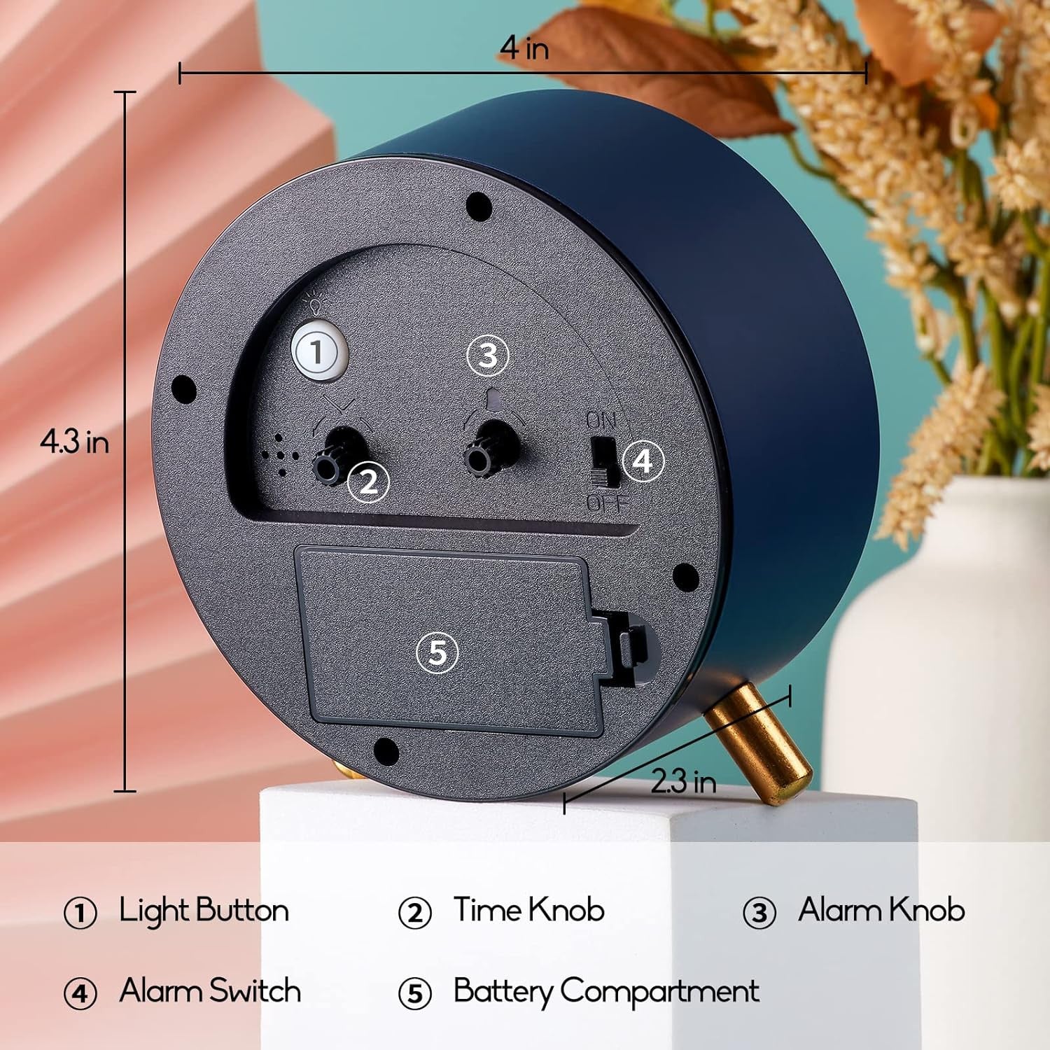 Super Silent Alarm Clock, Navy Blue Beep Wake Round Alarm Clock with Night Light, Battery Operated, Easy Set Entry Lux Style for Desk, Bedroom and Home Decoration
