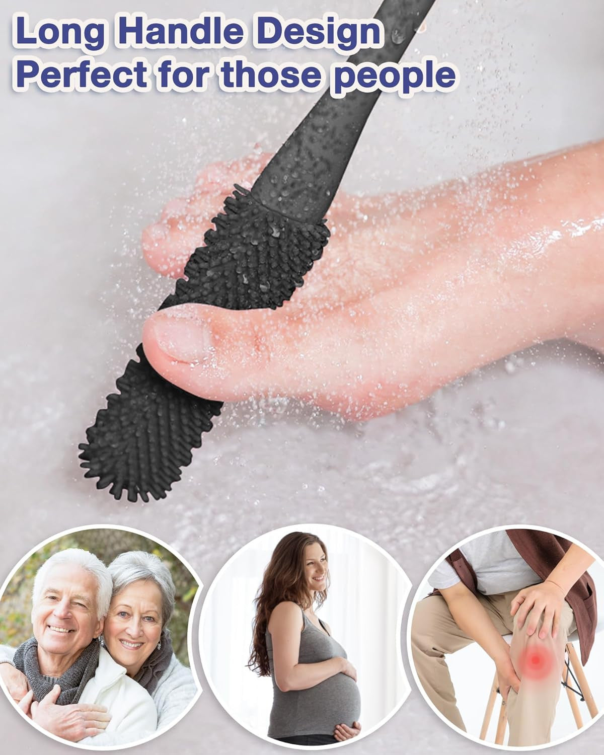 - Silicone soft brush: The long handle foot scrubber brush head was Silicone,is safe and tasteless Materials.handle is made of plastic, it is durable and strong,antiskid, waterproof, moisture-proof.The long handle and soft Silicone make it the perfect tool for cleaning your feet and toe.