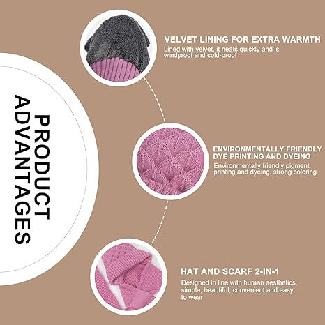 - 【BEST WINTER GIFT】This knitted plush and thick scarf hat is a super warm gift for yourself, family, and friends in the cold winter, give them a surprise